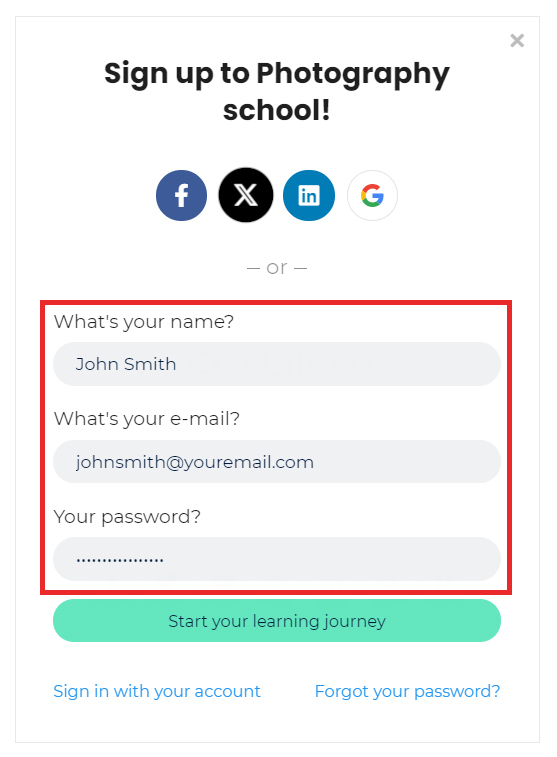 Fill out the simple registration form with your name, email and desired password and click on the Start your learning journey button.
